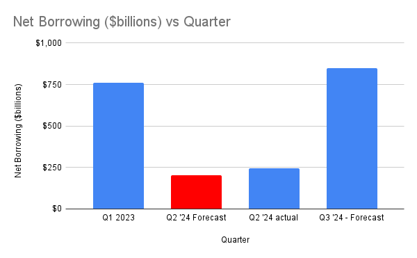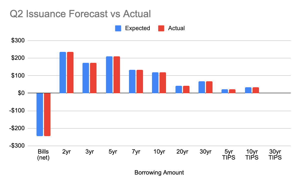 The $ value of actual issuance for Q2 came in higher than forecasted last quarter at $243b net borrowing, vs the expected $202b. This was due to lower than expected cash receipts/revenues. As well, Q3 forecasted issuance is going to be $847b which is above trend and significant.